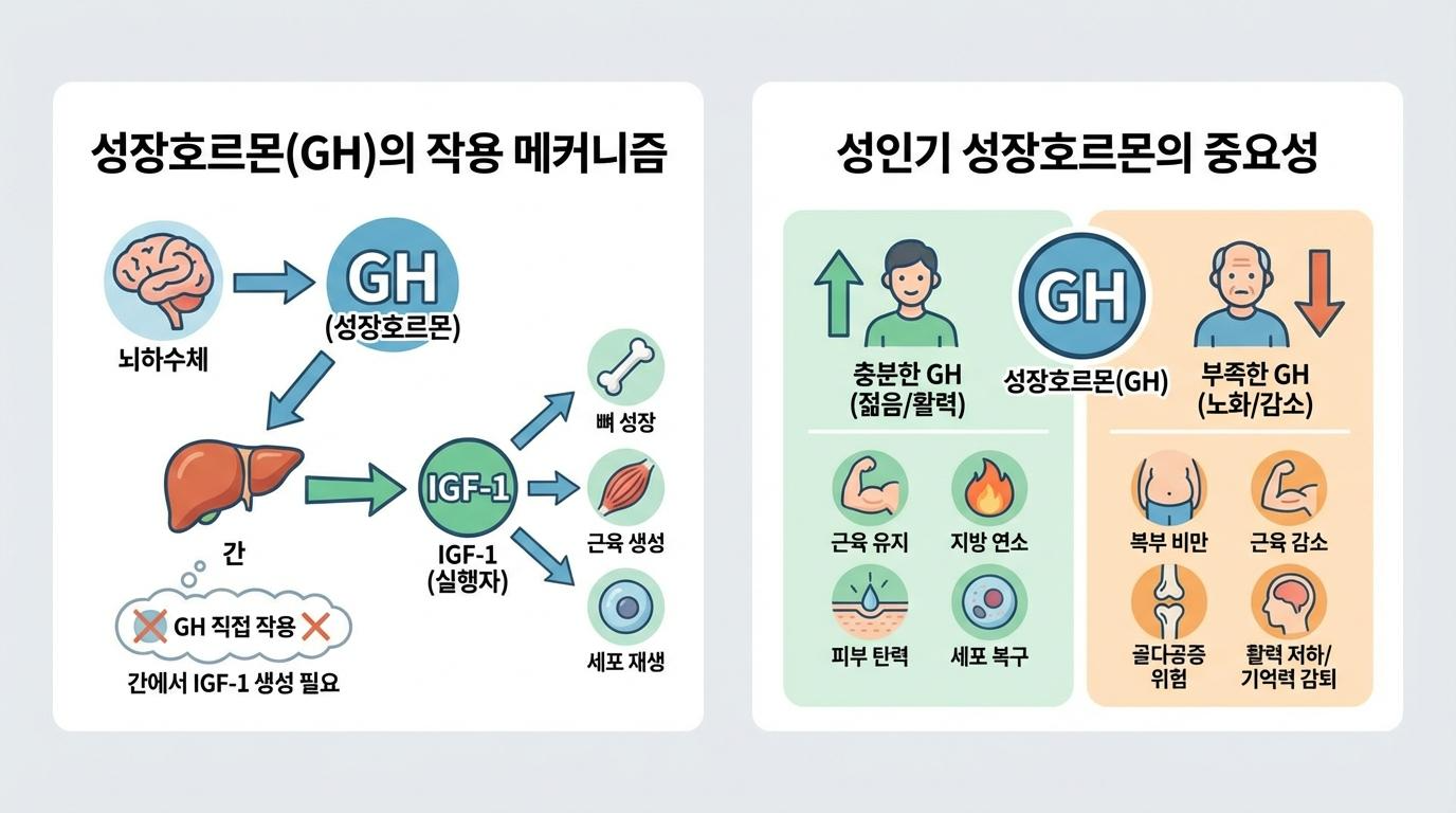 어린 시절, 누구나 한 번쯤은 키 번호가 앞자리에 배정될까 노심초사하며 우유를 들이키던 기억이 있을 것입니다. 줄넘기를 하면 성장판이 자극된다는 말에 매일 밤 마당에서 땀을 흘리기도 했고, 또래보다 조금만 작아도 부모님의 손에 이끌려 병원을 찾곤 했습니다. 이처럼 우리에게 ‘성장호르몬’은 오로지 ‘키’라는 숫자를 늘리기 위한 수단으로만 각인되어 왔습니다. 하지만 세월이 흘러 성인이 된 지금, 우리는 다시 한번 이 호르몬을 주목해야 합니다.