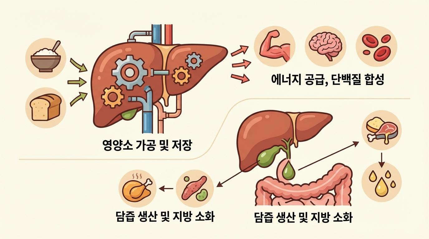 소화가 안 되어 속이 더부룩할 때 우리는 흔히 위장의 문제라고 생각합니다. 하지만 그 이면에는 간의 역할이 숨어 있습니다. 간은 소화 효소는 아니지만, 지방 소화에 없어서는 안 될 결정적인 물질인 '담즙(Bile)'을 생산하는 곳이기 때문입니다.