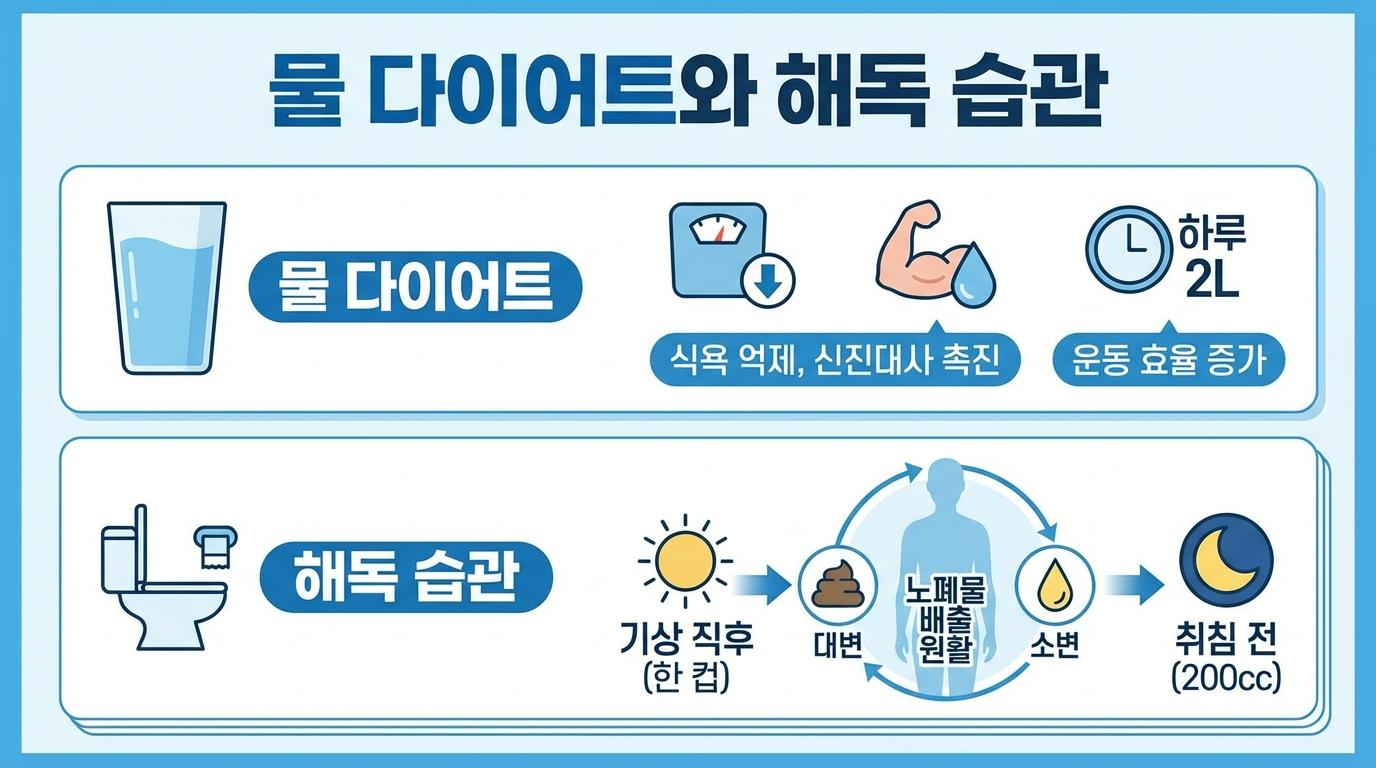 진정한 건강은 몸속에 유해 물질을 더하는 것이 아니라 빼내는 것(뺄셈의 건강법)에서 시작됩니다. 우리 몸으로 들어오는 유해 물질의 75%는 대변을 통해, 20%는 소변을 통해 배출되는데 이 과정의 핵심 매개체가 바로 물입니다. 물을 충분히 마시지 않으면 노폐물이 장에 오래 머물며 독소를 내뿜어 변비, 비만, 만성 피로 등을 유발할 수 있습니다.
