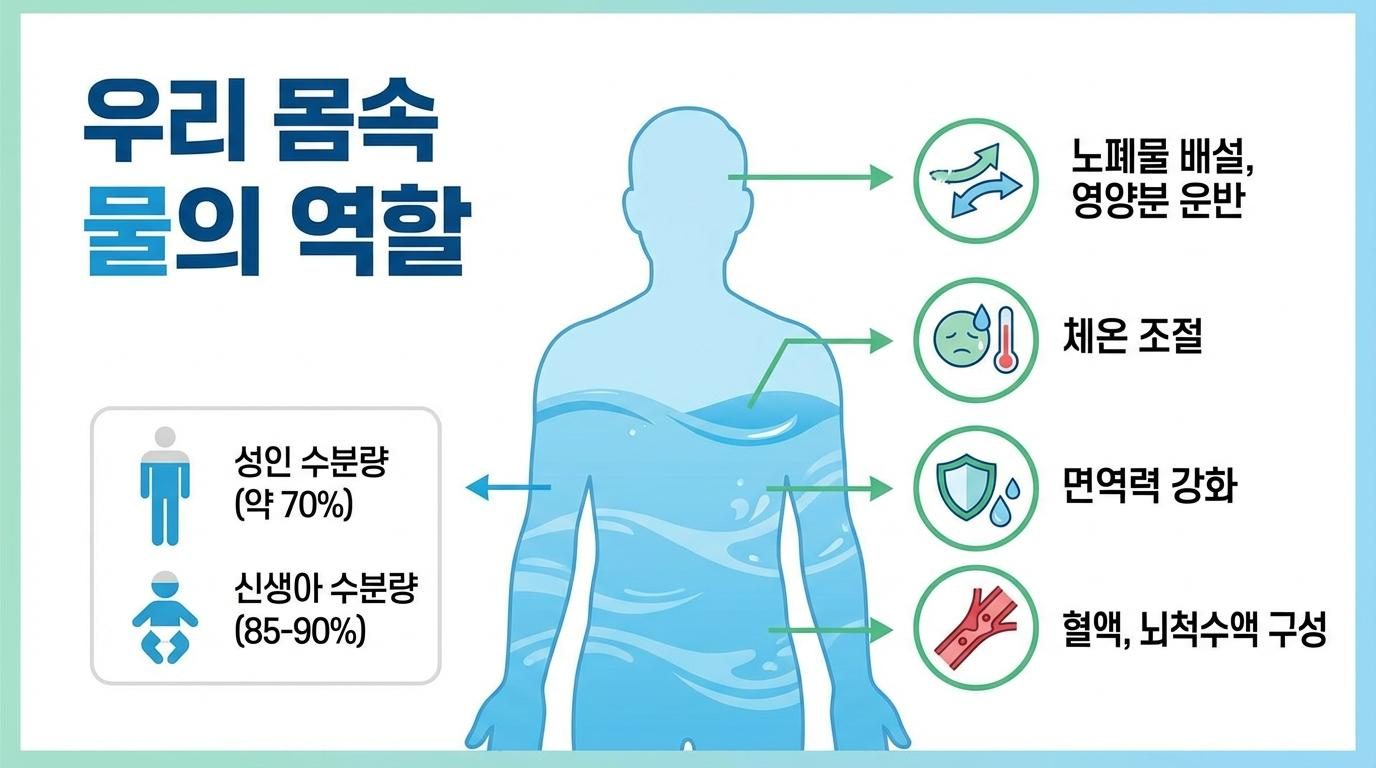 우리가 매일 마시는 물은 단순한 액체를 넘어 우리 몸의 모든 생명 활동을 주관하는 핵심 요소입니다. 인체는 노화가 진행됨에 따라 수분량이 줄어들며, 건강한 성인은 약 70%, 갓 태어난 신생아는 85~90%가 물로 구성되어 있습니다. 이처럼 우리 몸의 대부분을 차지하는 물이 인체 내에서 구체적으로 어떤 역할을 수행하는지, 그리고 이를 활용한 효과적인 다이어트 방법은 무엇인지 자세히 살펴보겠습니다.